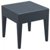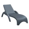 Wickerlook resin rattan gray outdoor chaise lounge set with two chaise lounges and two square side tables. Beautiful woven-wicker-looking chaise lounges with adjustable back and recessed wheels. Wickerlook resin is a natural looking un-woven one piece furniture technology. Made with open weave design that resembles traditional woven wicker furniture. Unlike any other woven furniture in the market Wickerlook furniture will never unravel. Made for commercial durability. Chaises are stackable. Perfect for hotels, community pools and condos. UV treated. Hose down for cleaning. Withstands outdoor temperatures summer and winter. Chaises certified for strict European standards by CATAS Italian research institute and test laboratory.