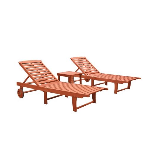 Malibu wood 3 piece beach & pool lounge set is the relaxing outdoor seating you've dreamed about for your back patio or pool. This set includes a small side table and 2 chaise loungers that made from 100% Eucalyptus - a very durable Hardwood, it can stand up to all kinds of changes in the weather. The cores of the Eucalyptus is very dense; thereby it quickly repels water, and its natural oil combats and repels wood eating insects.