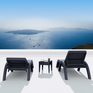 Triconfort Rivage poolside comfort set with two chaise lounges and two side tables. Top quality lacquered aluminum chaise lounges with oiled teak armrests. Exquisite look. Highest end aluminum outdoor furniture in the market. Chaise lounges are painted in the same manner as a luxury car. Multiple coatings of lacquer create superior outdoor protection and sleek looks. Seat and back in porotex mesh for extra comfort. Great choice for pool side, boats and yachts. Very elegant. 100% outdoors resistant. Light and comfortable. Triangular coffee tables come with sanded tempered glass top. Available in white frame-white mesh, gray frame-white mesh, gray frame-black mesh.