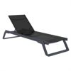 Tropic resort quality sling chaise lounge in dark gray frame with black mesh sling. Hybrid construction features aluminum and polypropylene frames. Simple sleek design with commercial strength. Sling is made with Serge Ferrari mesh fabric. Chaise is very comfortable and no need for cushions. Back adjustable to 5 positions and folds flat for more comfortable sun bathing. Recessed wheels for mobility. Stacks for easy storage. Large footstands for stability on any surface including beach and stone. Frame made of marine grade resin polypropylene. Extremely durable and comfortable. Commercial grade.