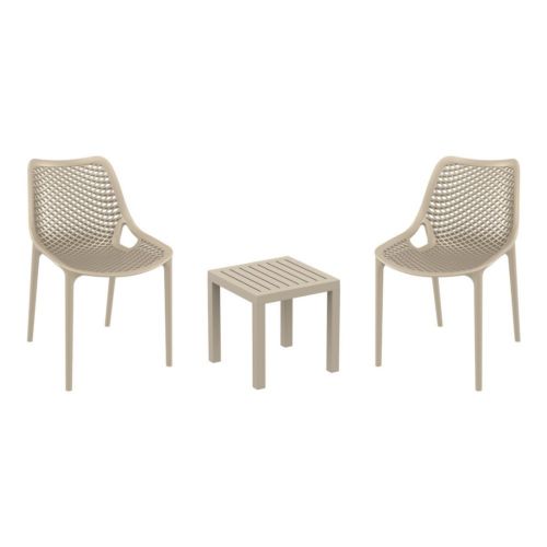 Air chairs and Ocean side table 3 piece conversation set in taupe is stylish and comfortable set for your small outdoor space! Made from durable and weather-resistant polypropylene resin, this set is perfect for balconies, terraces, decks, rooftops and patios. Air chairs feature a comfortable seat and backrest, making them the perfect choice for relaxing with a good book or enjoying a drink with a loved one. Two people can easily enjoy a refreshing drink together at Ocean side table.