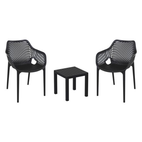 Air XL arm chairs and Ocean side table 3 piece conversation set in black is stylish and comfortable set for your small outdoor space! Made from durable and weather-resistant polypropylene resin, this set is perfect for balconies, terraces, decks, rooftops and patios. Air XL arm chairs feature a comfortable seat and backrest, making them the perfect choice for relaxing with a good book or enjoying a drink with a loved one. Two people can easily enjoy a refreshing drink together at Ocean side table.