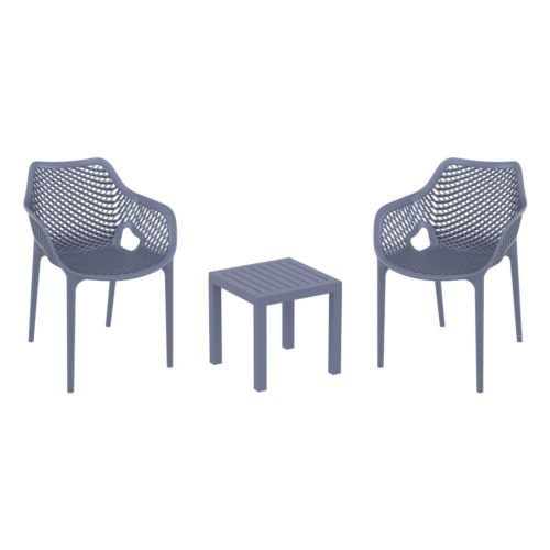 Air XL arm chairs and Ocean side table 3 piece conversation set in dark gray is stylish and comfortable set for your small outdoor space! Made from durable and weather-resistant polypropylene resin, this set is perfect for balconies, terraces, decks, rooftops and patios. Air XL arm chairs feature a comfortable seat and backrest, making them the perfect choice for relaxing with a good book or enjoying a drink with a loved one. Two people can easily enjoy a refreshing drink together at Ocean side table.