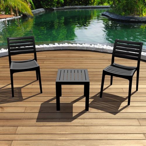 Ares chairs and Ocean side table 3 piece conversation set in black is stylish and comfortable set for your small outdoor space! Made from durable and weather-resistant polypropylene resin, this set is perfect for balconies, terraces, decks, rooftops and patios. Ares chairs feature a comfortable seat and backrest, making them the perfect choice for relaxing with a good book or enjoying a drink with a loved one. Two people can easily enjoy a refreshing drink together at Ocean side table.