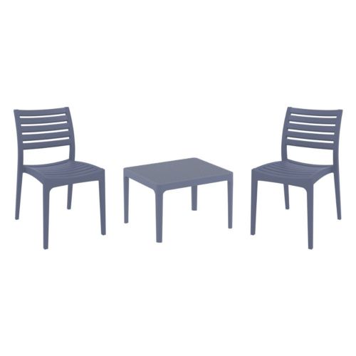 Ares chairs and Sky 24" side table 3 piece conversation set in dark gray is stylish and comfortable set for your small outdoor space! Made from durable and weather-resistant polypropylene resin, this set is perfect for balconies, terraces, decks, rooftops and patios. Ares chairs feature a comfortable seat and backrest, making them the perfect choice for relaxing with a good book or enjoying a drink with a loved one. Two people can easily enjoy a refreshing drink together at Sky 24" side table.