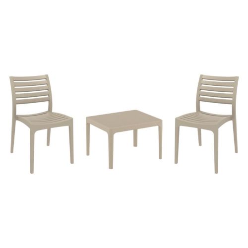 Ares chairs and Sky 24" side table 3 piece conversation set in taupe is stylish and comfortable set for your small outdoor space! Made from durable and weather-resistant polypropylene resin, this set is perfect for balconies, terraces, decks, rooftops and patios. Ares chairs feature a comfortable seat and backrest, making them the perfect choice for relaxing with a good book or enjoying a drink with a loved one. Two people can easily enjoy a refreshing drink together at Sky 24" side table.