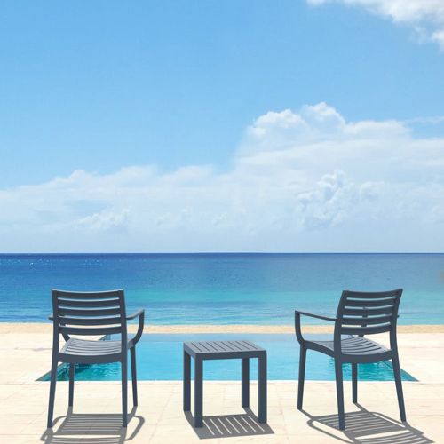 Artemis arm chairs and Ocean side table 3 piece conversation set in dark gray is stylish and comfortable set for your small outdoor space! Made from durable and weather-resistant polypropylene resin, this set is perfect for balconies, terraces, decks, rooftops and patios. Artemis arm chairs feature a comfortable seat and backrest, making them the perfect choice for relaxing with a good book or enjoying a drink with a loved one. Two people can easily enjoy a refreshing drink together at Ocean side table.