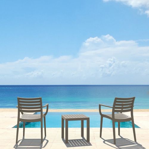 Artemis arm chairs and Ocean side table 3 piece conversation set in taupe is stylish and comfortable set for your small outdoor space! Made from durable and weather-resistant polypropylene resin, this set is perfect for balconies, terraces, decks, rooftops and patios. Artemis arm chairs feature a comfortable seat and backrest, making them the perfect choice for relaxing with a good book or enjoying a drink with a loved one. Two people can easily enjoy a refreshing drink together at Ocean side table.