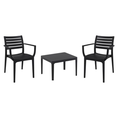 Artemis arm chairs and Sky 24" side table 3 piece conversation set in black is stylish and comfortable set for your small outdoor space! Made from durable and weather-resistant polypropylene resin, this set is perfect for balconies, terraces, decks, rooftops and patios. Artemis arm chairs feature a comfortable seat and backrest, making them the perfect choice for relaxing with a good book or enjoying a drink with a loved one. Two people can easily enjoy a refreshing drink together at Sky 24" side table.