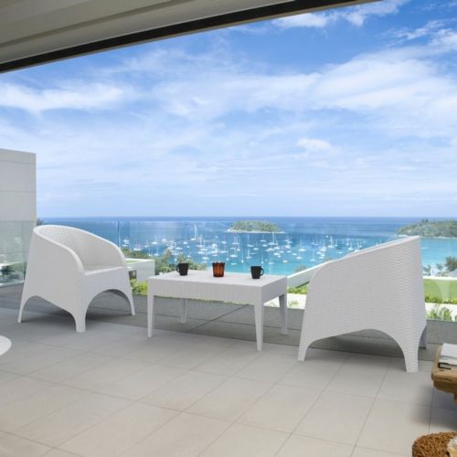 Aruba white Wickerlook resin patio set with two chairs and one rectangle table. Chairs are dining height but can also be used as accent chairs. Three piece set makes a great balcony group. Wickerlook resin is a natural looking un-woven one piece furniture technology reinforced with fiberglass. Unlike any other woven furniture in the market Wickerlook furniture will never unravel. No metal parts to rust, no moving parts that can break. Made for commercial durability. Chairs are stackable. Perfect for hotels and restaurants. UV treated. Hose down for cleaning. Withstands outdoor temperatures summer and winter. Chairs certified for strict European standards by CATAS Italian research institute and test laboratory.