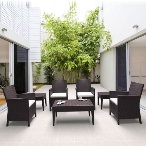 California Wickerlook resin patio set with four arm chairs, one coffee table and two side tables. California chairs can be used as a dining chair as well. Unlike any other woven furniture in the market Wickerlook furniture will never unravel. No metal parts to rust, no moving parts that can break. Made for commercial durability. Perfect for home use or hotels and restaurants. UV treated. Hose down for cleaning. Withstands outdoor temperatures summer and winter. Chairs are 23 lbs and great for balconies or use in windy areas. Color is rich brown. Chairs certified for strict European standards by CATAS Italian research institute and test laboratory.
