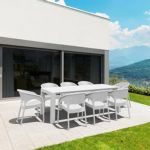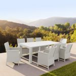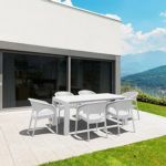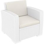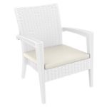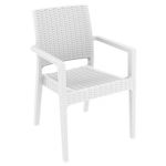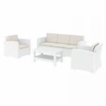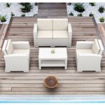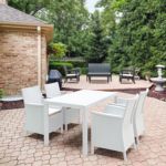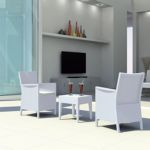 California Wickerlook resin patio set with four arm chairs, one coffee table and two side tables. California chairs can be used as a dining chair as well. Unlike any other woven furniture in the market Wickerlook furniture will never unravel. No metal parts to rust, no moving parts that can break. Made for commercial durability. Perfect for home use or hotels and restaurants. UV treated. Hose down for cleaning. Withstands outdoor temperatures summer and winter. Chairs are 23 lbs and great for balconies or use in windy areas. Chairs certified for strict European standards by CATAS Italian research institute and test laboratory.