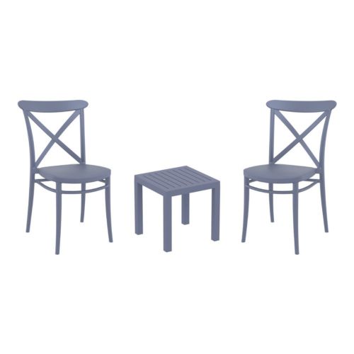 Cross chairs and Ocean side table 3 piece conversation set in dark gray is stylish and comfortable set for your small outdoor space! Made from durable and weather-resistant polypropylene resin, this set is perfect for balconies, terraces, decks, rooftops and patios. Cross chairs feature a comfortable seat and backrest, making them the perfect choice for relaxing with a good book or enjoying a drink with a loved one. Two people can easily enjoy a refreshing drink together at Ocean side table.