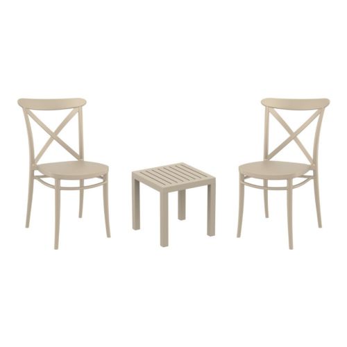 Cross chairs and Ocean side table 3 piece conversation set in taupe is stylish and comfortable set for your small outdoor space! Made from durable and weather-resistant polypropylene resin, this set is perfect for balconies, terraces, decks, rooftops and patios. Cross chairs feature a comfortable seat and backrest, making them the perfect choice for relaxing with a good book or enjoying a drink with a loved one. Two people can easily enjoy a refreshing drink together at Ocean side table.