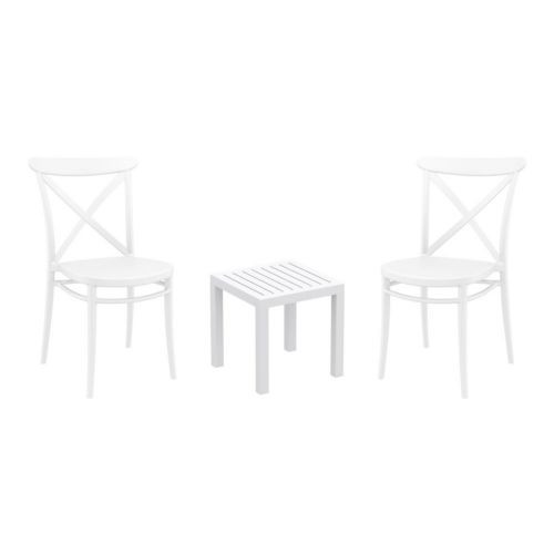 Cross chairs and Ocean side table 3 piece conversation set in white is stylish and comfortable set for your small outdoor space! Made from durable and weather-resistant polypropylene resin, this set is perfect for balconies, terraces, decks, rooftops and patios. Cross chairs feature a comfortable seat and backrest, making them the perfect choice for relaxing with a good book or enjoying a drink with a loved one. Two people can easily enjoy a refreshing drink together at Ocean side table.