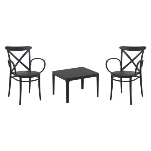 Cross XL arm chairs and Sky 24" side table 3 piece conversation set in black is stylish and comfortable set for your small outdoor space! Made from durable and weather-resistant polypropylene resin, this set is perfect for balconies, terraces, decks, rooftops and patios. Cross XL arm chairs feature a comfortable seat and backrest, making them the perfect choice for relaxing with a good book or enjoying a drink with a loved one. Two people can easily enjoy a refreshing drink together at Sky 24" side table.