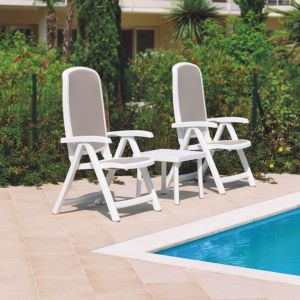 Color: White - Blue SlingThese chairs adjust to three different positions and are very comfortable, as well as being beautiful. The little table is very useful. We decided to order the round table as well as the Alpha loungers to complete the set. We have four white chairs from Cozy Days, which we bought in 2015. Customer Service is excellent and we will always order from this company.