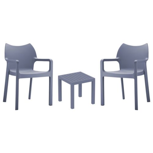 Diva arm chairs and Ocean side table 3 piece conversation set in dark gray is stylish and comfortable set for your small outdoor space! Made from durable and weather-resistant polypropylene resin, this set is perfect for balconies, terraces, decks, rooftops and patios. Diva arm chairs feature a comfortable seat and backrest, making them the perfect choice for relaxing with a good book or enjoying a drink with a loved one. Two people can easily enjoy a refreshing drink together at Ocean side table.