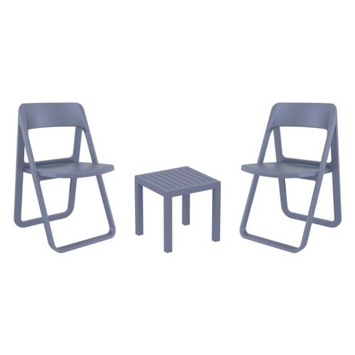 Dream folding chairs and Ocean side table 3 piece conversation set in dark gray is stylish and comfortable set for your small outdoor space! Made from durable and weather-resistant polypropylene resin, this set is perfect for balconies, terraces, decks, rooftops and patios. Dream folding chairs feature a comfortable seat and backrest, making them the perfect choice for relaxing with a good book or enjoying a drink with a loved one. Two people can easily enjoy a refreshing drink together at Ocean side table.