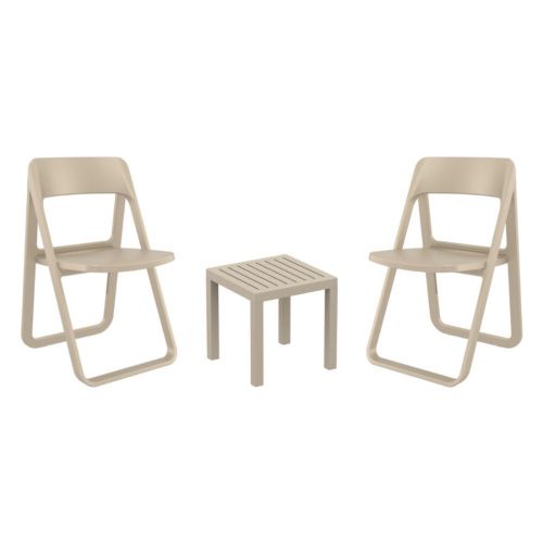 Dream folding chairs and Ocean side table 3 piece conversation set in taupe is stylish and comfortable set for your small outdoor space! Made from durable and weather-resistant polypropylene resin, this set is perfect for balconies, terraces, decks, rooftops and patios. Dream folding chairs feature a comfortable seat and backrest, making them the perfect choice for relaxing with a good book or enjoying a drink with a loved one. Two people can easily enjoy a refreshing drink together at Ocean side table.