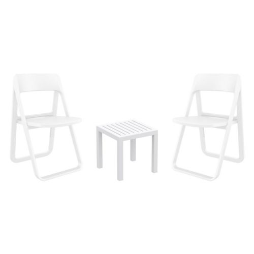 Dream folding chairs and Ocean side table 3 piece conversation set in white is stylish and comfortable set for your small outdoor space! Made from durable and weather-resistant polypropylene resin, this set is perfect for balconies, terraces, decks, rooftops and patios. Dream folding chairs feature a comfortable seat and backrest, making them the perfect choice for relaxing with a good book or enjoying a drink with a loved one. Two people can easily enjoy a refreshing drink together at Ocean side table.