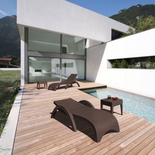 WickerLook LogoWickerlook resin outdoor chaise lounge set with two chaise lounges and two square side tables. Beautiful woven-wicker-looking chaise lounges with adjustable back and recessed wheels. Wickerlook resin is a natural looking un-woven one piece furniture technology. Made with open weave design that resembles traditional woven wicker furniture. Unlike any other woven furniture in the market Wickerlook furniture will never unravel. Made for commercial durability. Chaises are stackable. Perfect for hotels, community pools and condos. UV treated. Hose down for cleaning. Withstands outdoor temperatures summer and winter. Chaises certified for strict European standards by CATAS Italian research institute and test laboratory.