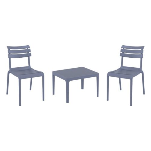 Helen chairs and Sky 24" side table 3 piece conversation set in dark gray is stylish and comfortable set for your small outdoor space! Made from durable and weather-resistant polypropylene resin, this set is perfect for balconies, terraces, decks, rooftops and patios. Helen chairs feature a comfortable seat and backrest, making them the perfect choice for relaxing with a good book or enjoying a drink with a loved one. Two people can easily enjoy a refreshing drink together at Sky 24" side table.