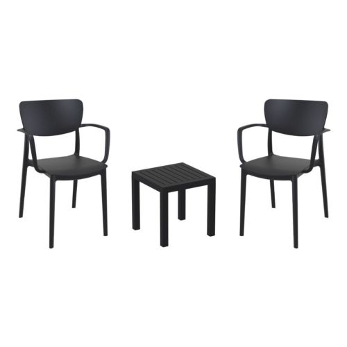 Lisa chairs and Ocean side table 3 piece conversation set in black is stylish and comfortable set for your small outdoor space! Made from durable and weather-resistant polypropylene resin, this set is perfect for balconies, terraces, decks, rooftops and patios. Lisa chairs feature a comfortable seat and backrest, making them the perfect choice for relaxing with a good book or enjoying a drink with a loved one. Two people can easily enjoy a refreshing drink together at Ocean side table.