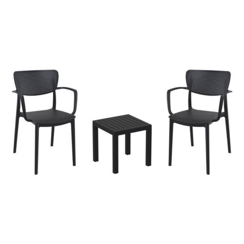Loft arm chairs and Ocean side table 3 piece conversation set in black is stylish and comfortable set for your small outdoor space! Made from durable and weather-resistant polypropylene resin, this set is perfect for balconies, terraces, decks, rooftops and patios. Loft arm chairs feature a comfortable seat and backrest, making them the perfect choice for relaxing with a good book or enjoying a drink with a loved one. Two people can easily enjoy a refreshing drink together at Ocean side table.