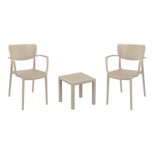 Loft arm chairs and Ocean side table 3 piece conversation set in taupe is stylish and comfortable set for your small outdoor space! Made from durable and weather-resistant polypropylene resin, this set is perfect for balconies, terraces, decks, rooftops and patios. Loft arm chairs feature a comfortable seat and backrest, making them the perfect choice for relaxing with a good book or enjoying a drink with a loved one. Two people can easily enjoy a refreshing drink together at Ocean side table.