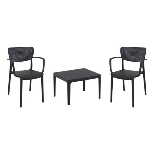 Loft arm chairs and Sky 24" side table 3 piece conversation set in black is stylish and comfortable set for your small outdoor space! Made from durable and weather-resistant polypropylene resin, this set is perfect for balconies, terraces, decks, rooftops and patios. Loft arm chairs feature a comfortable seat and backrest, making them the perfect choice for relaxing with a good book or enjoying a drink with a loved one. Two people can easily enjoy a refreshing drink together at Sky 24" side table.