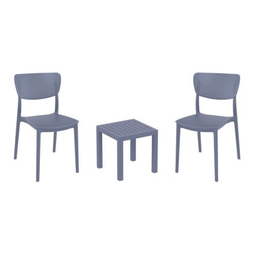 Lucy chairs and Ocean side table 3 piece conversation set in dark gray is stylish and comfortable set for your small outdoor space! Made from durable and weather-resistant polypropylene resin, this set is perfect for balconies, terraces, decks, rooftops and patios. Lucy chairs feature a comfortable seat and backrest, making them the perfect choice for relaxing with a good book or enjoying a drink with a loved one. Two people can easily enjoy a refreshing drink together at Ocean side table.
