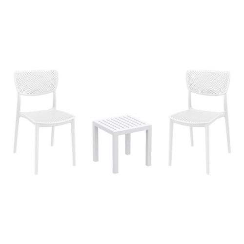 Lucy chairs and Ocean side table 3 piece conversation set in white is stylish and comfortable set for your small outdoor space! Made from durable and weather-resistant polypropylene resin, this set is perfect for balconies, terraces, decks, rooftops and patios. Lucy chairs feature a comfortable seat and backrest, making them the perfect choice for relaxing with a good book or enjoying a drink with a loved one. Two people can easily enjoy a refreshing drink together at Ocean side table.