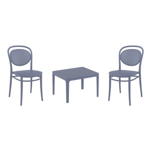 Marcel chairs and Sky 24" side table 3 piece conversation set in dark gray is stylish and comfortable set for your small outdoor space! Made from durable and weather-resistant polypropylene resin, this set is perfect for balconies, terraces, decks, rooftops and patios. Marcel chairs feature a comfortable seat and backrest, making them the perfect choice for relaxing with a good book or enjoying a drink with a loved one. Two people can easily enjoy a refreshing drink together at Sky 24" side table.