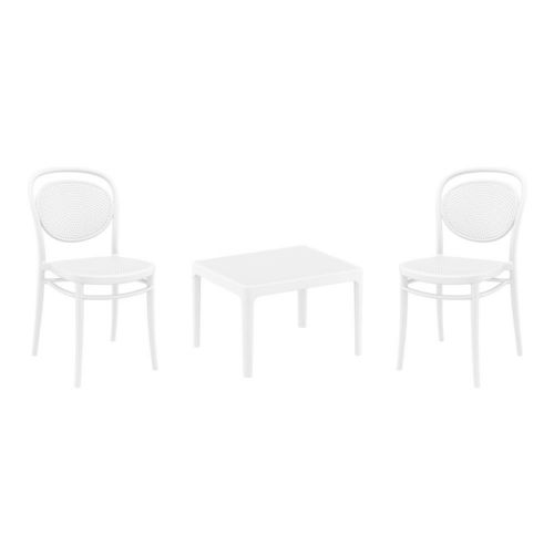 Marcel chairs and Sky 24" side table 3 piece conversation set in white is stylish and comfortable set for your small outdoor space! Made from durable and weather-resistant polypropylene resin, this set is perfect for balconies, terraces, decks, rooftops and patios. Marcel chairs feature a comfortable seat and backrest, making them the perfect choice for relaxing with a good book or enjoying a drink with a loved one. Two people can easily enjoy a refreshing drink together at Sky 24" side table.