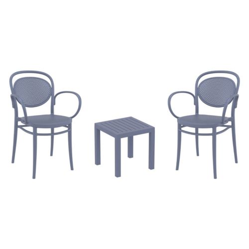 Marcel XL arm chairs and Ocean side table 3 piece conversation set in dark gray is stylish and comfortable set for your small outdoor space! Made from durable and weather-resistant polypropylene resin, this set is perfect for balconies, terraces, decks, rooftops and patios. Marcel XL arm chairs feature a comfortable seat and backrest, making them the perfect choice for relaxing with a good book or enjoying a drink with a loved one. Two people can easily enjoy a refreshing drink together at Ocean side table.