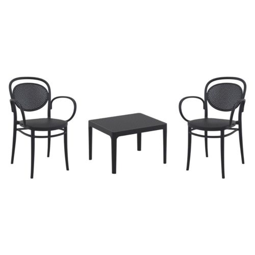 Marcel XL arm chairs and Sky 24" side table 3 piece conversation set in black is stylish and comfortable set for your small outdoor space! Made from durable and weather-resistant polypropylene resin, this set is perfect for balconies, terraces, decks, rooftops and patios. Marcel XL arm chairs feature a comfortable seat and backrest, making them the perfect choice for relaxing with a good book or enjoying a drink with a loved one. Two people can easily enjoy a refreshing drink together at Sky 24" side table.