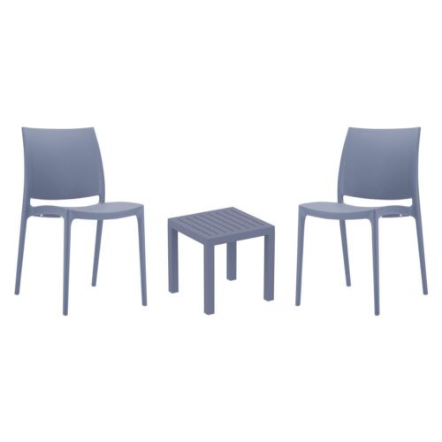 Maya chairs and Ocean side table 3 piece conversation set in dark gray is stylish and comfortable set for your small outdoor space! Made from durable and weather-resistant polypropylene resin, this set is perfect for balconies, terraces, decks, rooftops and patios. Maya chairs feature a comfortable seat and backrest, making them the perfect choice for relaxing with a good book or enjoying a drink with a loved one. Two people can easily enjoy a refreshing drink together at Ocean side table.