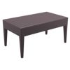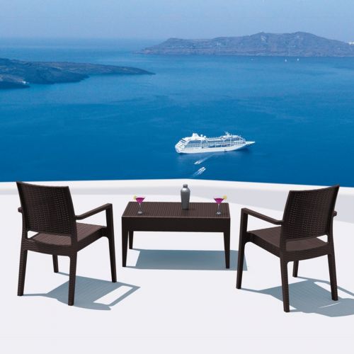 Miami brown Wickerlook resin balcony furniture set with two armchairs and one rectangle coffee table. Dining height chairs are spacy for comfortable seating. Wickerlook resin is a natural looking un-woven one piece furniture technology. Wickerlook outdoor furniture is made with open weave design that resembles traditional woven wicker furniture. Unlike any other woven furniture in the market Wickerlook furniture will never unravel. No metal parts that can rust and no moving parts that can break. Made for commercial durability. Chairs are stackable. UV treated. Hose down for cleaning. Withstands outdoor temperatures summer and winter. Perfect for balconies in all weather conditions. Chairs certified for strict European standards by CATAS Italian research institute and test laboratory.
