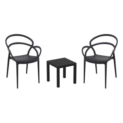 Mila arm chairs and Ocean side table 3 piece conversation set in black is stylish and comfortable set for your small outdoor space! Made from durable and weather-resistant polypropylene resin, this set is perfect for balconies, terraces, decks, rooftops and patios. Mila arm chairs feature a comfortable seat and backrest, making them the perfect choice for relaxing with a good book or enjoying a drink with a loved one. Two people can easily enjoy a refreshing drink together at Ocean side table.