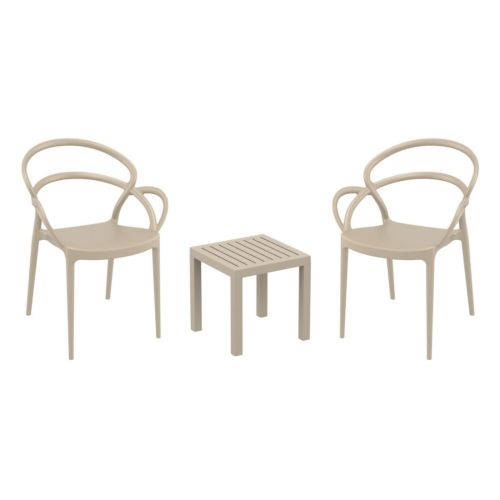 Mila arm chairs and Ocean side table 3 piece conversation set in taupe is stylish and comfortable set for your small outdoor space! Made from durable and weather-resistant polypropylene resin, this set is perfect for balconies, terraces, decks, rooftops and patios. Mila arm chairs feature a comfortable seat and backrest, making them the perfect choice for relaxing with a good book or enjoying a drink with a loved one. Two people can easily enjoy a refreshing drink together at Ocean side table.