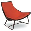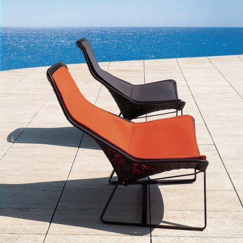 Maia collection outdoor lounging set with two relax lounge chairs and one side table from Kettal. Contemporary designer outdoor collection with fine aluminum craftsmanship. Maia outdoor lounge chairs are made with full aluminum and fibre frame with padded porotex mesh cushions. Chairs are very spacy and comfortable. Modern and sleek design. Available in chestnut or white color. Cushions available in white, gray and orange. Side table top in screen printed black glass.
