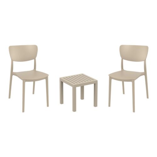 Monna chairs and Ocean side table 3 piece conversation set in taupe is stylish and comfortable set for your small outdoor space! Made from durable and weather-resistant polypropylene resin, this set is perfect for balconies, terraces, decks, rooftops and patios. Monna chairs feature a comfortable seat and backrest, making them the perfect choice for relaxing with a good book or enjoying a drink with a loved one. Two people can easily enjoy a refreshing drink together at Ocean side table.
