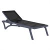Pacific resort quality pool chaise lounge set with two stacking chaises and one side table in dark gray frame and black mesh sling. Elegant modern looks with commercial strength. Chaise lounge is perfect for pools and beach areas. Sling is made with Serge Ferrari mesh fabric. Chaise is very comfortable and no need for cushions. Back adjustable to 5 positions and folds flat for more comfortable sun bathing. Recessed wheels make it easy to move around. Sun lounger stacks for easy storage. High quality marine grade sling dries quick and doesn't stick to bare skin. Frame made of marine grade resin. Extremely durable and comfortable. Commercial grade.