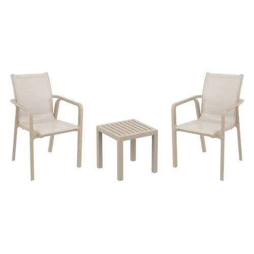 Pacific sling arm chairs and Ocean side table 3 piece balcony set in taupe is stylish and comfortable set for your small outdoor space! Made from durable and weather-resistant polypropylene resin, this set is perfect for balconies, terraces, decks, rooftops and patios. Pacific sling arm chairs feature a comfortable seat and backrest, making them the perfect choice for relaxing with a good book or enjoying a drink with a loved one. Two people can easily enjoy a refreshing drink together at Ocean side table.