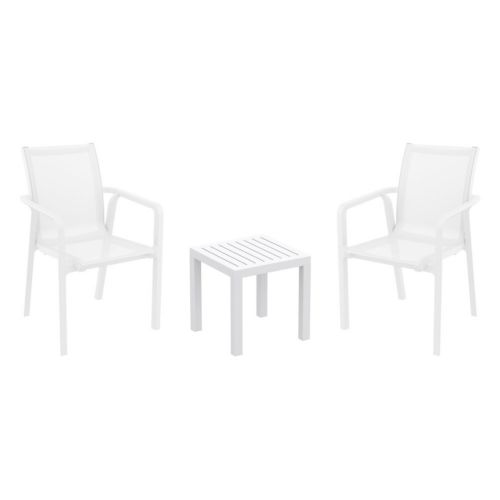 Pacific sling arm chairs and Ocean side table 3 piece balcony set in white is stylish and comfortable set for your small outdoor space! Made from durable and weather-resistant polypropylene resin, this set is perfect for balconies, terraces, decks, rooftops and patios. Pacific sling arm chairs feature a comfortable seat and backrest, making them the perfect choice for relaxing with a good book or enjoying a drink with a loved one. Two people can easily enjoy a refreshing drink together at Ocean side table.