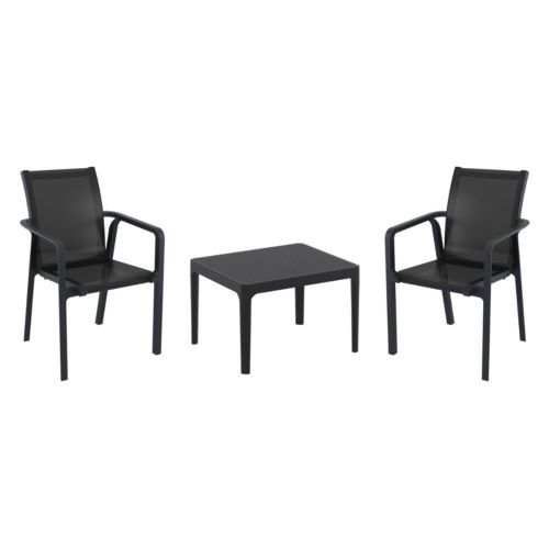 Pacific sling arm chairs and Sky 24" side table 3 piece balcony set in black is stylish and comfortable set for your small outdoor space! Made from durable and weather-resistant polypropylene resin, this set is perfect for balconies, terraces, decks, rooftops and patios. Pacific sling arm chairs feature a comfortable seat and backrest, making them the perfect choice for relaxing with a good book or enjoying a drink with a loved one. Two people can easily enjoy a refreshing drink together at Sky 24" side table.