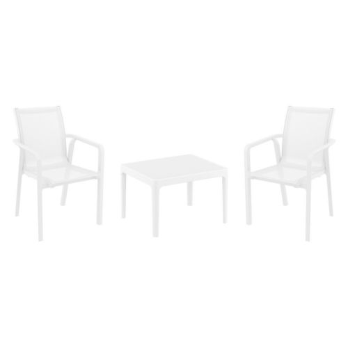 Pacific sling arm chairs and Sky 24" side table 3 piece balcony set in white is stylish and comfortable set for your small outdoor space! Made from durable and weather-resistant polypropylene resin, this set is perfect for balconies, terraces, decks, rooftops and patios. Pacific sling arm chairs feature a comfortable seat and backrest, making them the perfect choice for relaxing with a good book or enjoying a drink with a loved one. Two people can easily enjoy a refreshing drink together at Sky 24" side table.