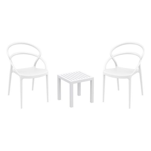Pia chairs and Ocean side table 3 piece conversation set in white is stylish and comfortable set for your small outdoor space! Made from durable and weather-resistant polypropylene resin, this set is perfect for balconies, terraces, decks, rooftops and patios. Pia chairs feature a comfortable seat and backrest, making them the perfect choice for relaxing with a good book or enjoying a drink with a loved one. Two people can easily enjoy a refreshing drink together at Ocean side table.