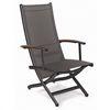 Triconfort Rivage aluminum sling lounge set with two multiposition chairs and one side table and two footstools. Top quality lacquered aluminum lounge chairs with oiled teak armrests. Chairs can be used as a dining chair and as a lounge chair. Exquisite look. Highest end aluminum outdoor furniture in the market. All items are painted in the same manner as a luxury car. Multiple coatings of lacquer create superior outdoor protection and sleek looks. Seat and back in porotex mesh for extra comfort. Great choice for pool side, boats and yachts. Very elegant. 100% outdoors resistant. Light and comfortable. Triangular coffee tables come with sanded tempered glass top. Available in white frame-white mesh, gray frame-white mesh, gray frame-black mesh.